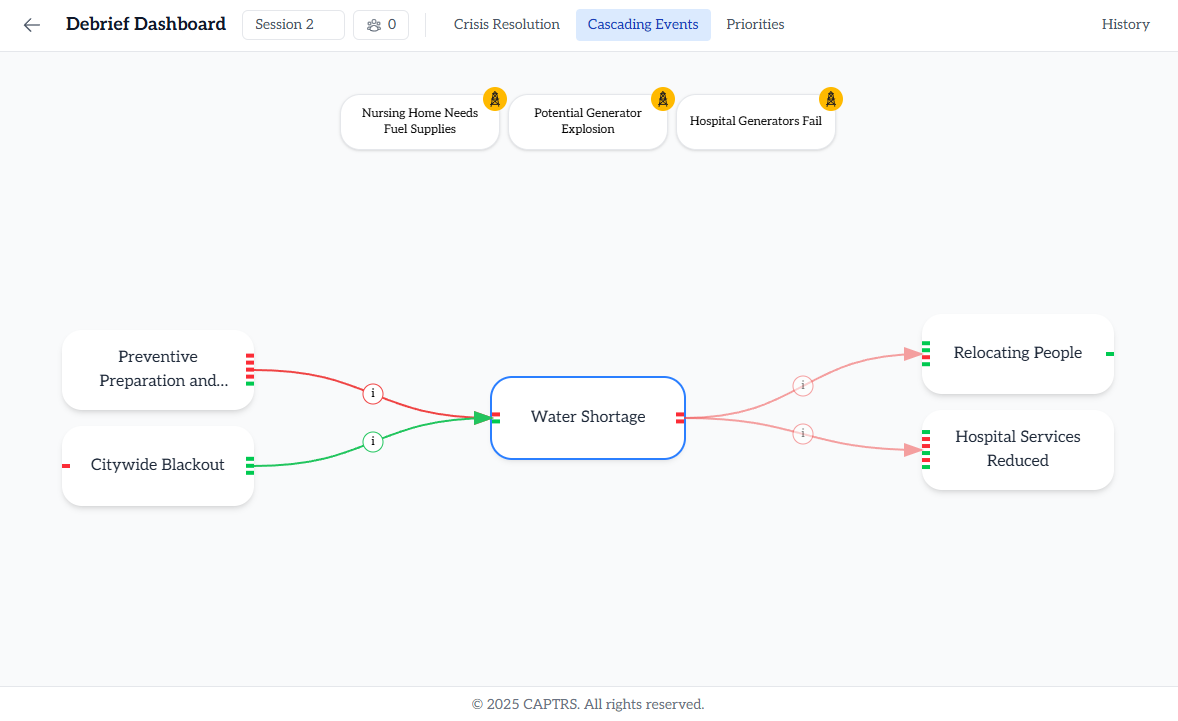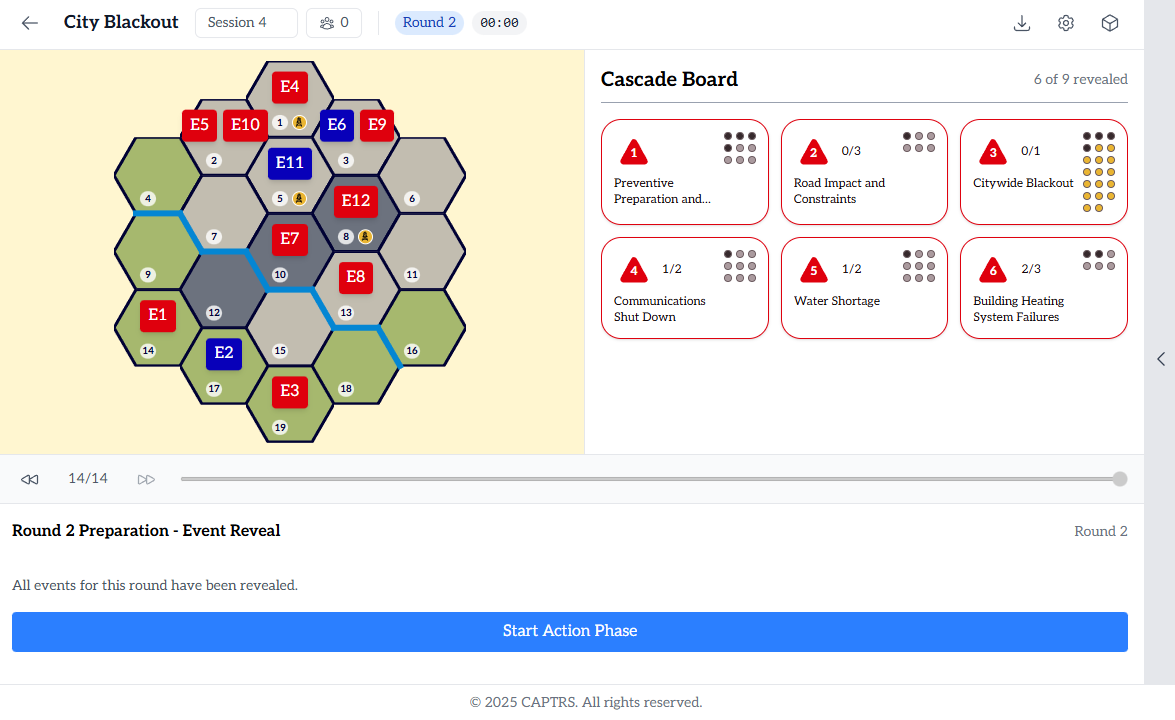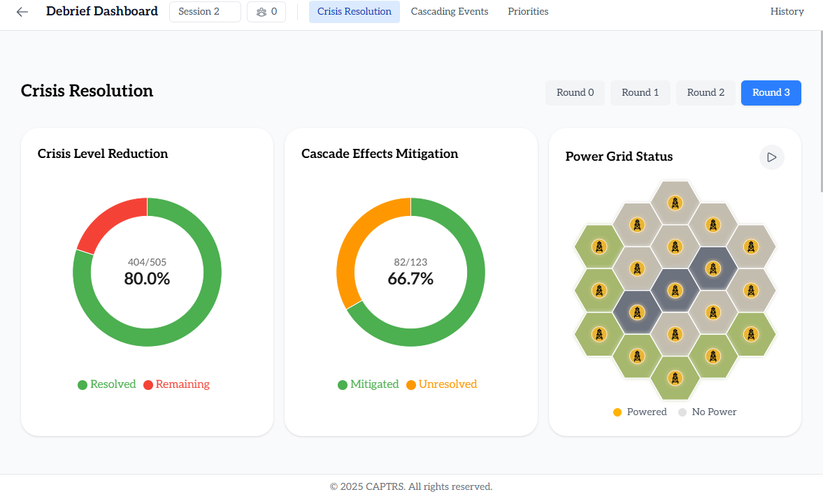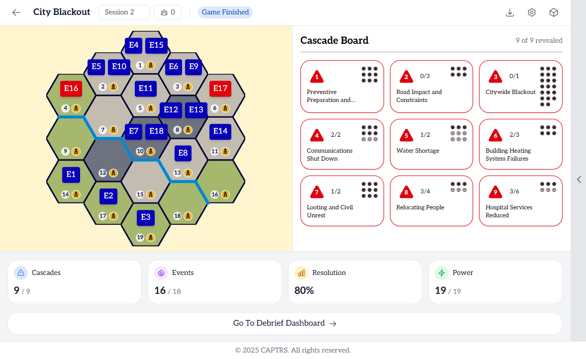 After three game rounds that each introduce escalating threats and cascading effects, players analyze their decisions and outcomes by reviewing the game state (snapshot of the crisis situation at that point) and conducting deeper analysis using the digital app.